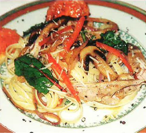 With olive oil: saute garlic, sun-dried tomatoes, mushrooms, bell pepper, and spinach for 3 to 4 minutes. Add poached nutria meat and saute for 3 minutes until hot. Add fettuccine, saute then serve. Top with Parmesan cheese. Makes 4 servings.